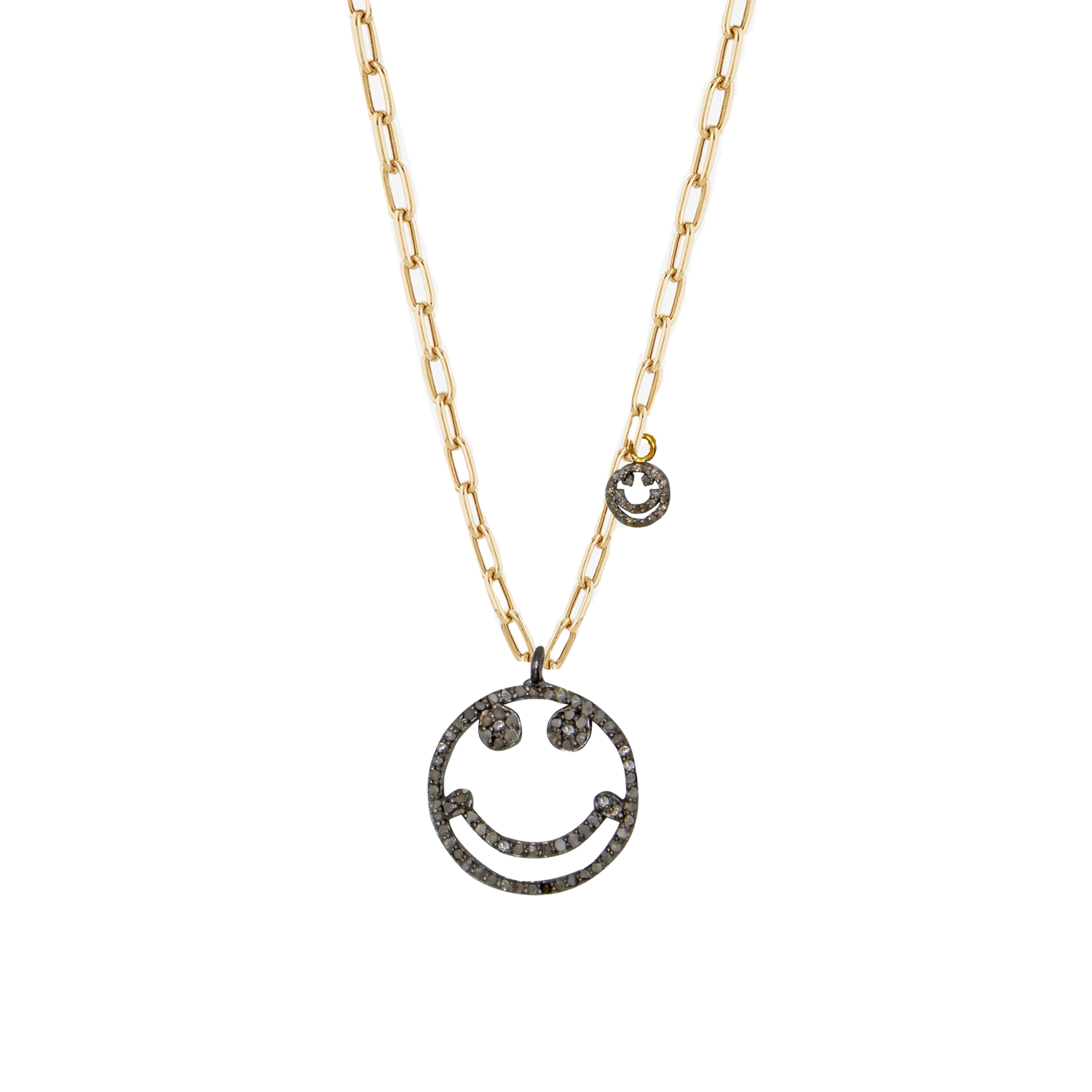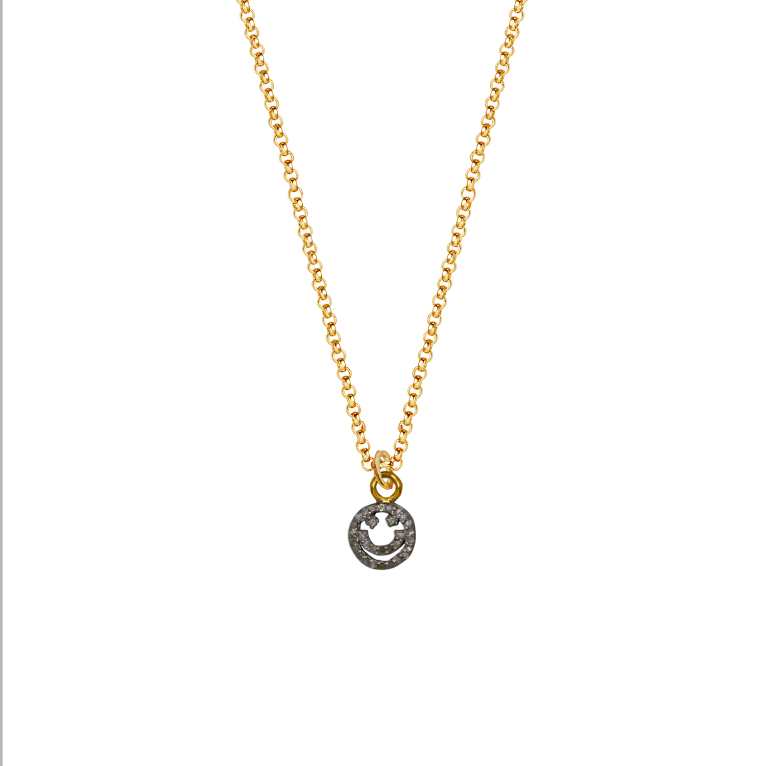 Make a subtle statement with the Mini Supreme Happy Face Charm Necklace—a downsized icon of joy, style, and playful luxury. Crafted from oxidized sterling silver and adorned with shimmering antique-cut diamonds, it delivers the same signature sparkle and detail as the original, in a refined, compact form. Perfect for layering or wearing solo, the Mini Supreme Happy Face is minimalist in size but maximalist in charm—bringing joy and bold character to any look.